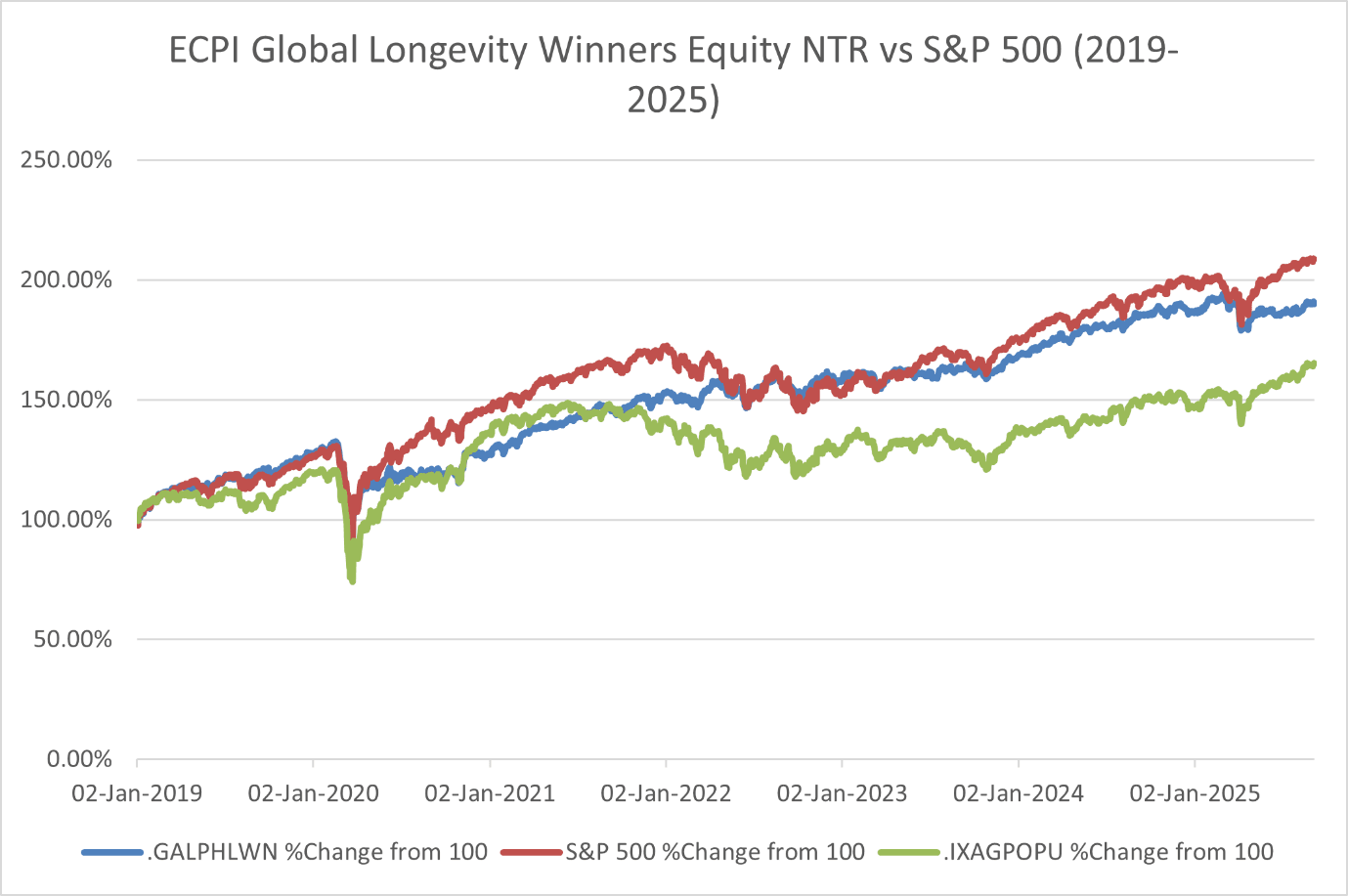 - ECPI Global Longevity Winners Equity NTR (GALPHLWN): Thematic index met blootstelling aan bedrijven in ontwikkelde markten die profiteren van een stijgende levensverwachting, o.a. in verzekeringen, gezondheidszorg, farmacie, consumentengoederen, vastgoed en geselecteerde technologie- en industriële sectoren.