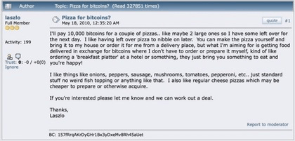Het was 22 mei 2010 toen Laszlo Hanyecz, een programmeur uit Florida, op een Bitcoin-forum, BitcoinTalk, het aanbod plaatste om twee grote pizza's te kopen voor 10.000 bitcoins dat we hieronder zien.