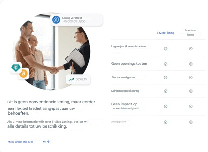 Bit2Me is een toonaangevend Spaans (beschikbaar in Nederland) platform voor cryptocurrency diensten, gekenmerkt door het aanbieden van diensten die veel verder gaan dan alleen de aankoop en verkoop van cryptocurrencies; waaronder, uiteraard, de mogelijkheid om leningen met cryptocurrencies te verstrekken, met een gebruiksvriendelijke en aangename interface, geschikt voor investeerders van alle niveaus.
