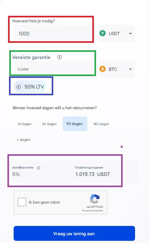 Hoe hoger de LTV (loan-to-value) die je aanvraagt, hoe lager de leenvergoeding (commissie van de exchange), maar ook hoe strakker de prijzendalingslimiet wordt van de cryptovaluta die je als onderpand hebt geplaatst.