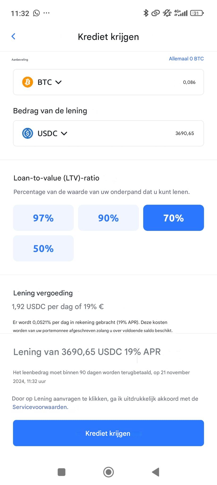 En we gaan verder met de Spaanse exchange bij uitstek, Bit2Me, opnieuw via hun mobiele app, waar het aanvragen van een cryptolening veel intuïtiever is
