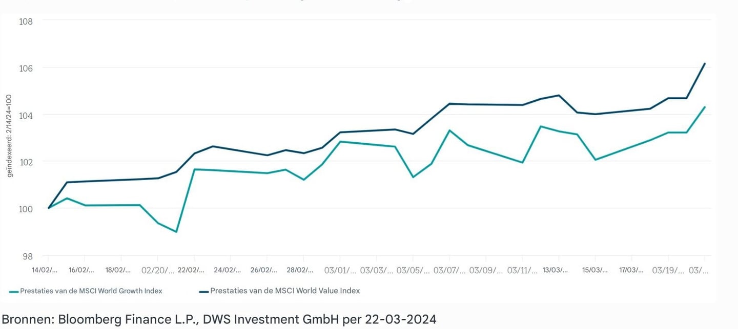 - Matige groei: Hoewel ze minder vaak dalen in dalende markten, hebben ze ook de neiging om iets minder te groeien dan gemiddeld in zeer stijgende markten; dit komt vaak doordat deze bedrijven al zoveel zijn gegroeid dat ze hun "plafond hebben bereikt" en, bij gebrek aan grote groeimogelijkheden, zullen hun aandelen logischerwijs ook niet enorm in waarde stijgen. Zoals je in de volgende grafiek ziet, is het historische rendement van waardeaandelen (veel van hen defensief), vergeleken met groeiaandelen, relatief lager en veel voorspelbaarder.