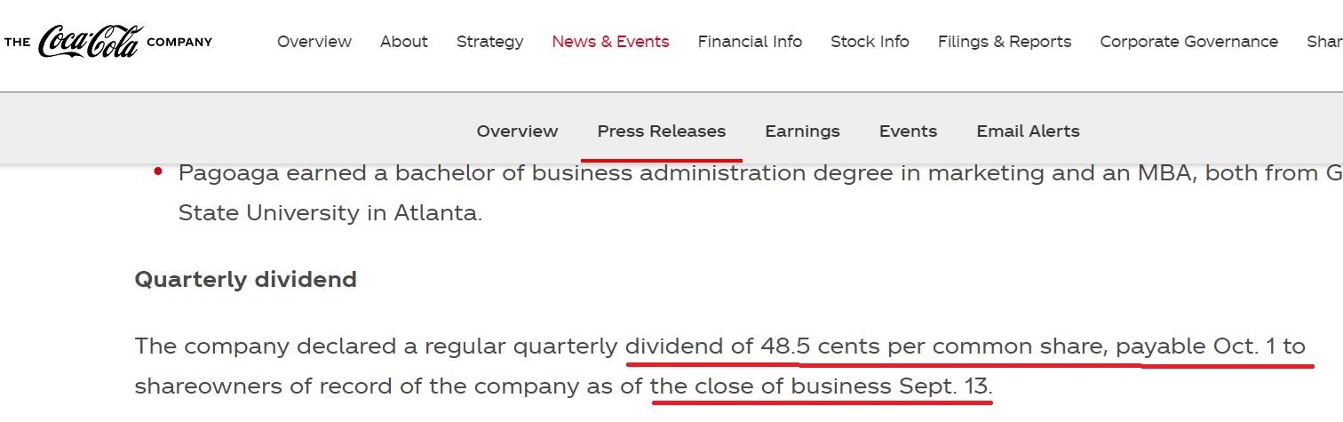Hieronder laat ik je het voorbeeld zien van de dividendverklaring van een van de dividendkoningen, Coca-Cola, op hun website per 29 juli 2024.