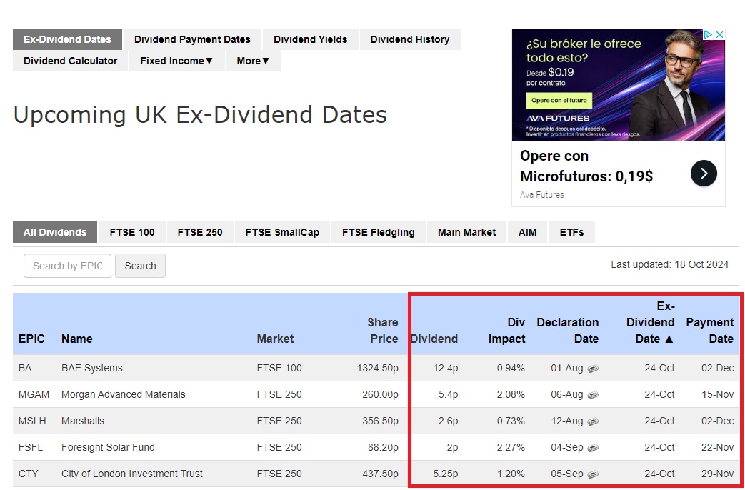 Bijvoorbeeld, voor Engelse bedrijven geeft de website Dividend Data informatie over de verklaringsdata, ex-dividenddata en betaaldatum.