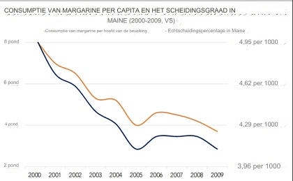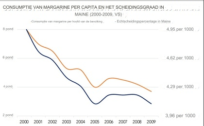 In deze grafiek zien we het echtscheidingspercentage in de staat Maine en de per capita consumptie van margarine. Ze hebben een correlatie van 99,26%!