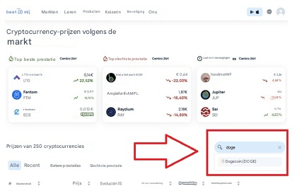 Daar, schrijven we de naam van de munt en klikken erop (voor dit voorbeeld zoeken we Dogecoin op zijn ticker "DOGE")
