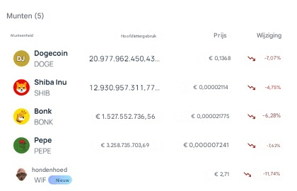 Laten we nu een lijst bekijken met enkele van de populairste memecoins: