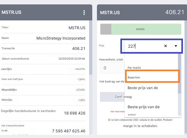 Nu, eenmaal deze stap is voltooid, is het tijd om te beginnen met investeren. Hiervoor hoef je alleen maar naar de zoekfunctie van de broker (groene rechthoek) te gaan en de naam van het bedrijf in te voeren “MicroStrategy” (groene rechthoek), of je kunt ook hun ticker (MSTR) of ISIN (US5949724083) invoeren.
