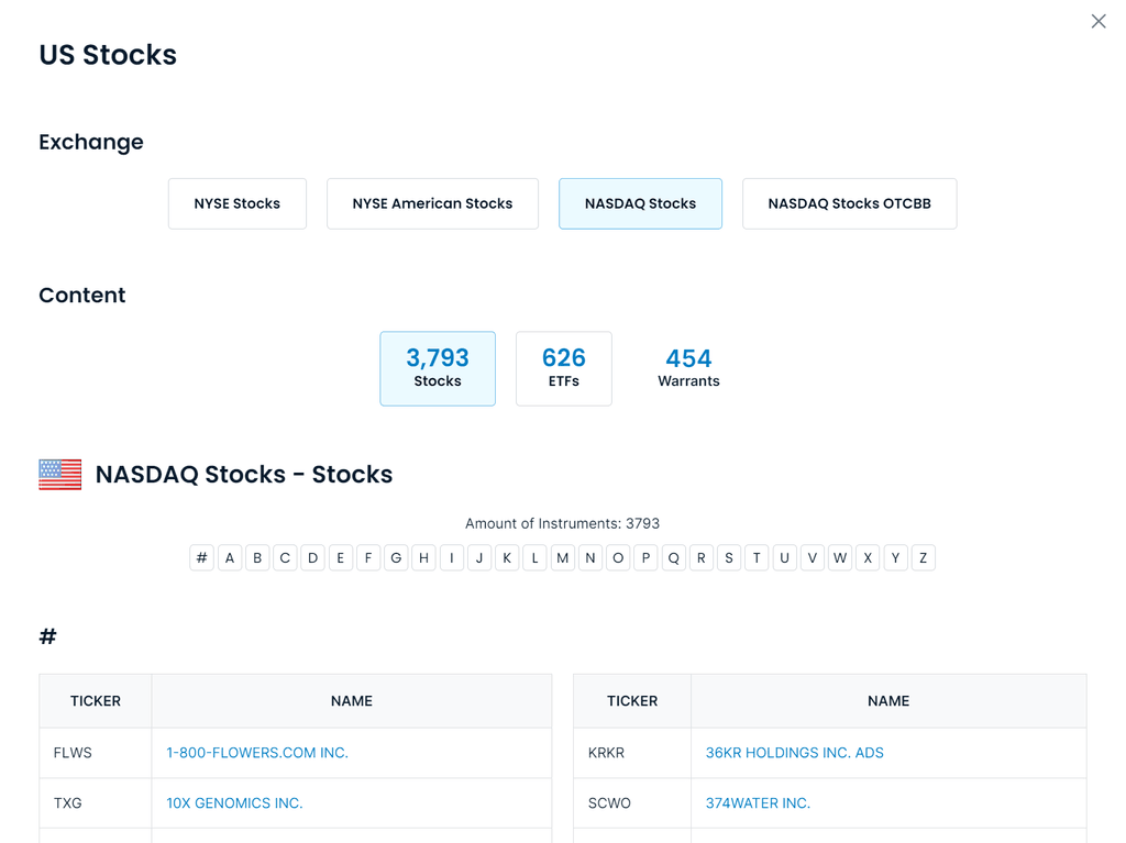 Vanaf daar variëren de commissies afhankelijk van de broker die je kiest. Hier zie je een voorbeeld van kosten en commissies inbegrepen voor meer dan 6500 aandelen en bijna 3500 ETF's uit de VS.